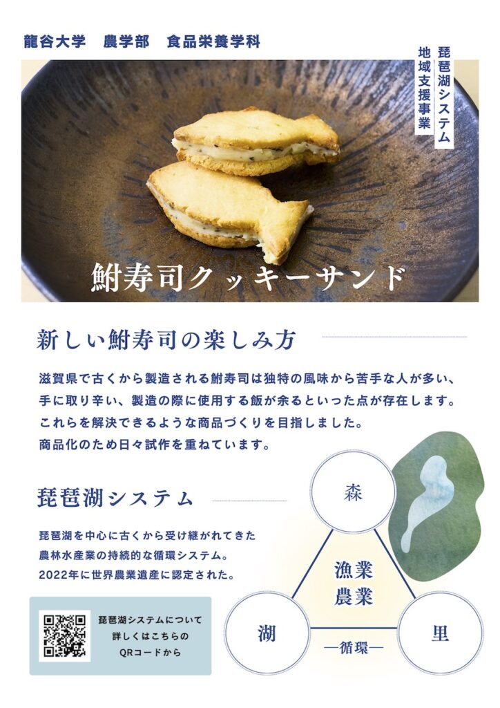 今回の大会会場内で試食・提供した「鮒寿司クッキーサンド」開発プロジェクトは、琵琶湖の固有種であるニゴロブナの雄など、これまで利用が限られてきた低・未利用魚を活用し、滋賀の伝統的発酵食・鮒寿司を現代の食卓に親しみやすい形で届けることを目的とした取り組みです。本学農学部食品栄養学科の学生が中心となってアイデアを出し、試作と改良を重ねたクッキーサンドは、伝統と新しさを融合させたユニークな一品として来場者の注目を集めました。