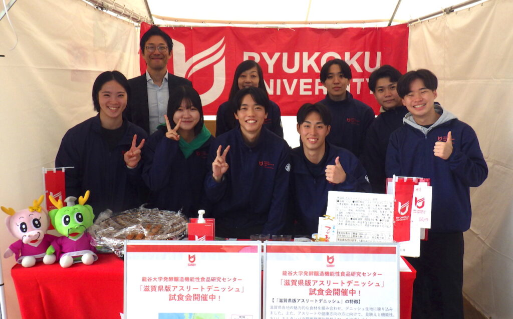 当日は、商品開発に携わった本学教員・研究員のほか、本学スポーツサイエンスコース(経営・経済・法・政策学部)の松永ゼミ生と社会学部の大西ゼミ生もブース運営に参加し、来場者へ直接「滋賀県版アスリートデニッシュ」の試作品を配布し、説明とアンケート調査実施を行いました。
